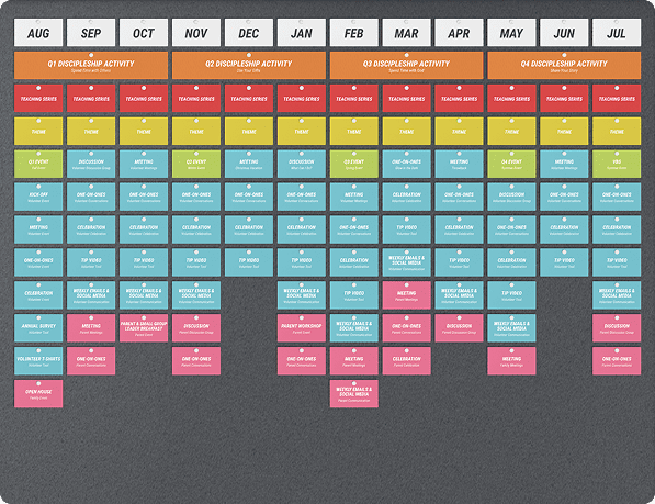 Our color-coded strategy view helps ministry leaders map out an entire year of ministry. You’ll always know what’s happening each month as you teach your kids and teenagers, connect with families, and equip your volunteers.